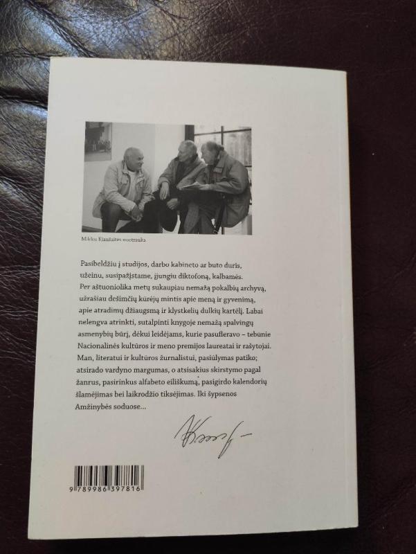 „Pasibeldžiu į studijos, darbo kabineto ar buto duris, užeinu, susipažįstame, įjungiu diktofoną, kalbamės. Per aštuoniolika metų sukaupiau nemažą pokalbių archyvą, užrašiau dešimčių kūrėjų mintis apie meną ir gyvenimą, apie atradimų džiaugsmą ir klystkelių dulkių kartėlį. Labai nelengva atrinkti, sutalpinti knygoje nemažą spalvingų asmenybių būrį, dėkui leidėjams, kurie pasufleravo – tebūnie Nacionalinės kultūros ir meno premijos laureatai ir rašytojai. Man, literatui ir kultūros žurnalistui, pasiūlymas patiko; atsirado vardyno margumas, o atsisakius skirstymo pagal žanrus, pasirinkus alfabeto eiliškumą, pasigirdo kalendorių šlamėjimas bei laikrodžio tiksėjimas. Iki šypsenos Amžinybės soduose...“ – Vidmantas Kiaušas