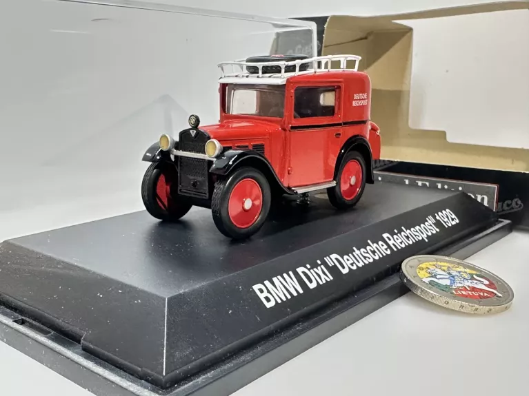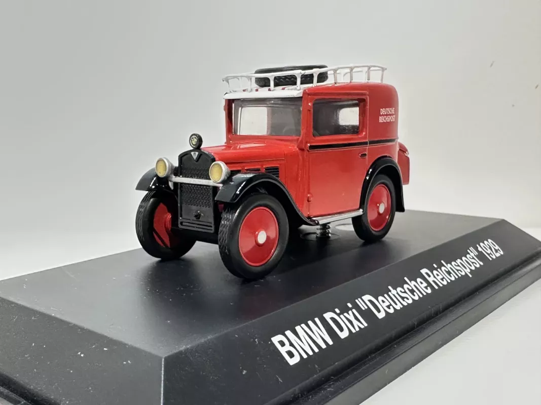 BMW Dixi 1929 Reichspost 1:43 Schuco Kolekcinis modeliukas. Uždaro tipo. Iš kolekcijos, vitrina, dėžutė, geros būklės. Apie 10cm ilgio diecast (metalinis), raudonas-juodas. Nuotraukos yra aprašymo dalis